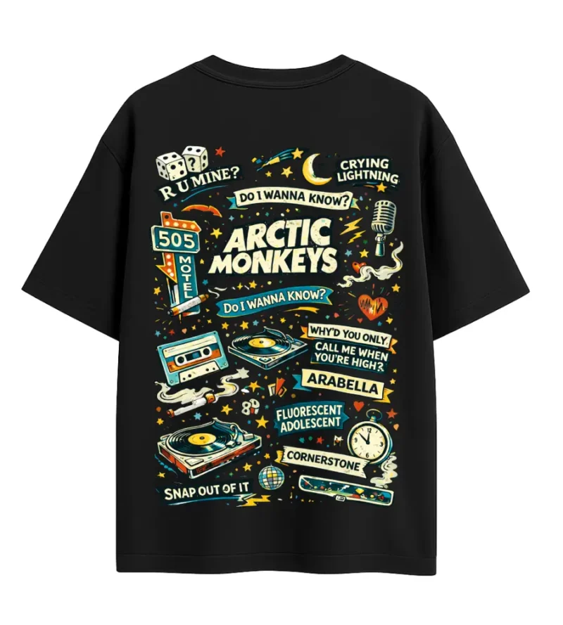 Inspired by the iconic energy of Arctic Monkeys, bringing together a vibrant collage of retro music culture of vinyl players, cassettes, neon signs, and lyrical references that capture the spirit of late-night indie nostalgia.
