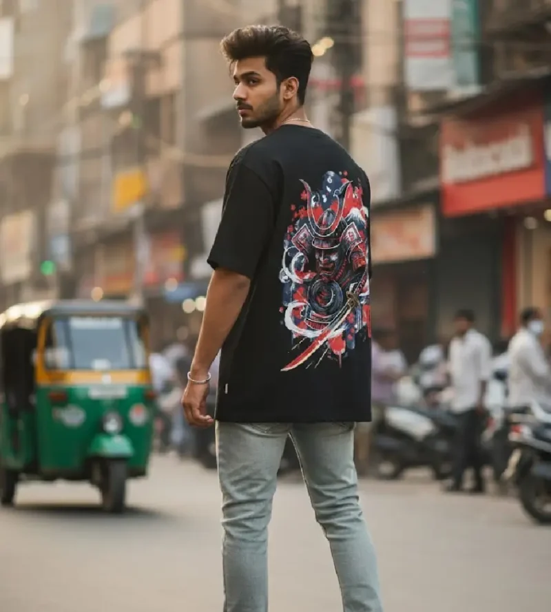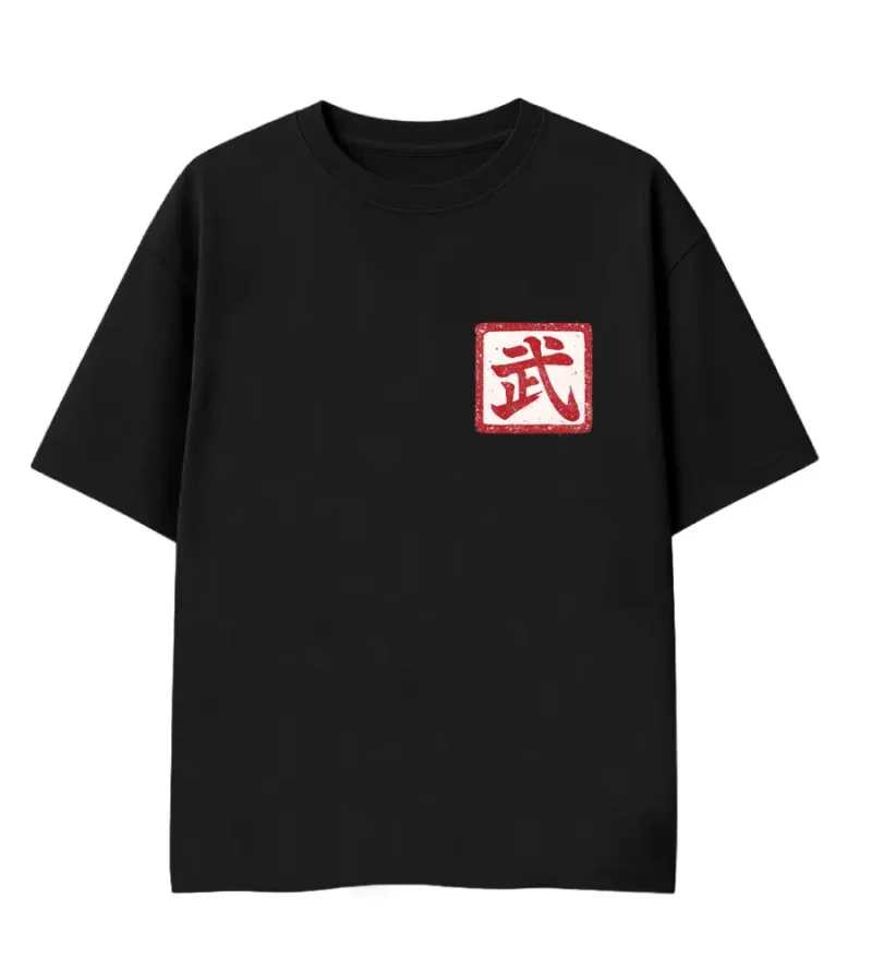 Ink, steel, and honor. This intense back-print features a menacing samurai helmet in a dynamic ink-wash style, capturing the darker side of the warrior code.