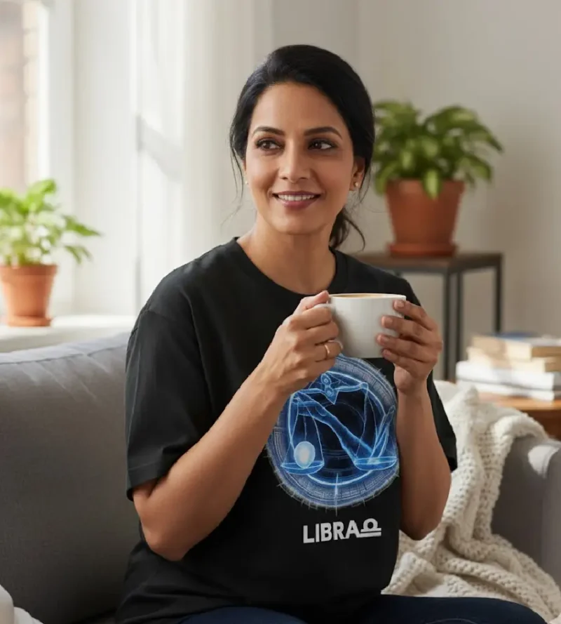 Balanced by nature, futuristic by design. Represent your sign with this electric blue graphic that captures the intellectual spirit of the Libra.