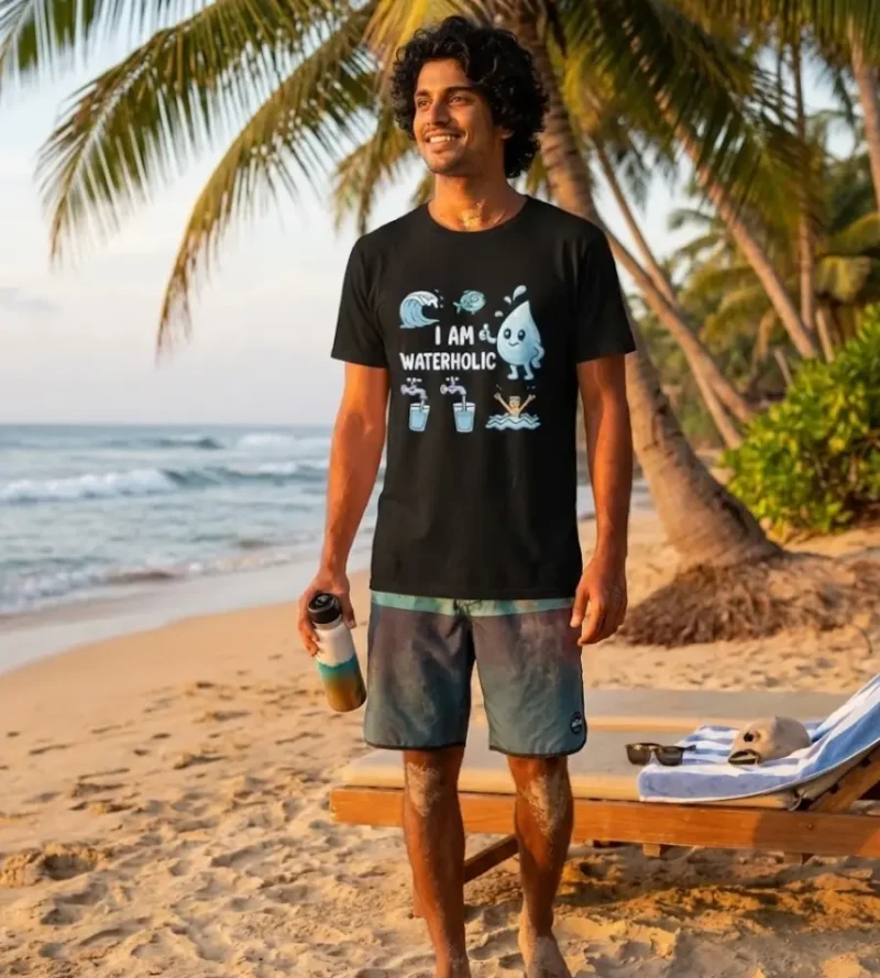 Stay hydrated, stay happy. A fun, cartoon-style tribute to the love of H2O, featuring a happy water drop and everything cool and refreshing.
